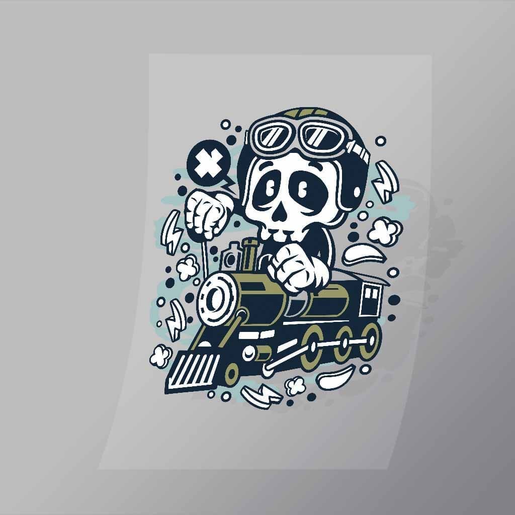 A great Skull Train DTF (Direct to Film) Transfer available in multiple sizes. (Beased on width at artwork aspect ratio)