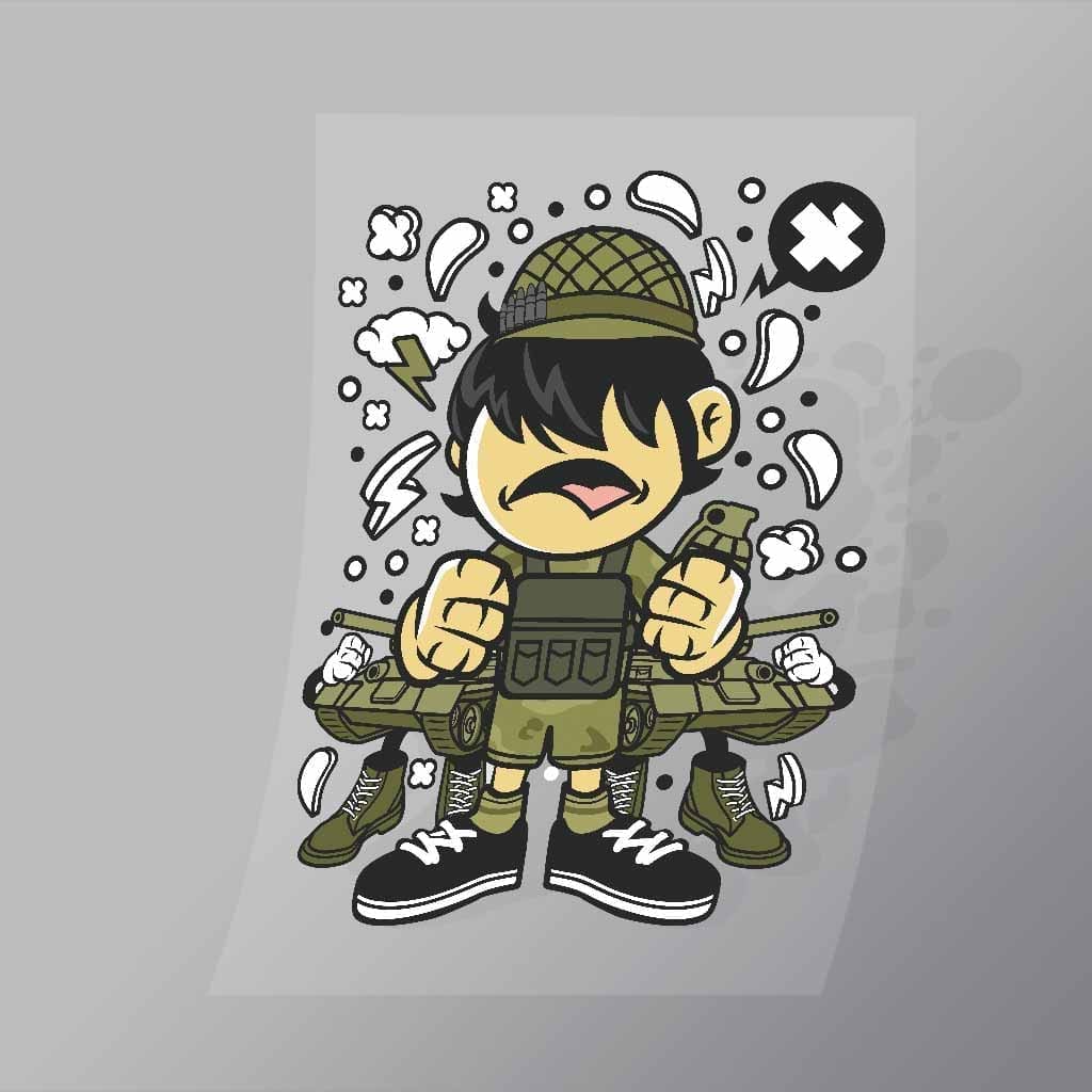 A great Soldier Kid DTF (Direct to Film) Transfer available in multiple sizes. (Beased on width at artwork aspect ratio)