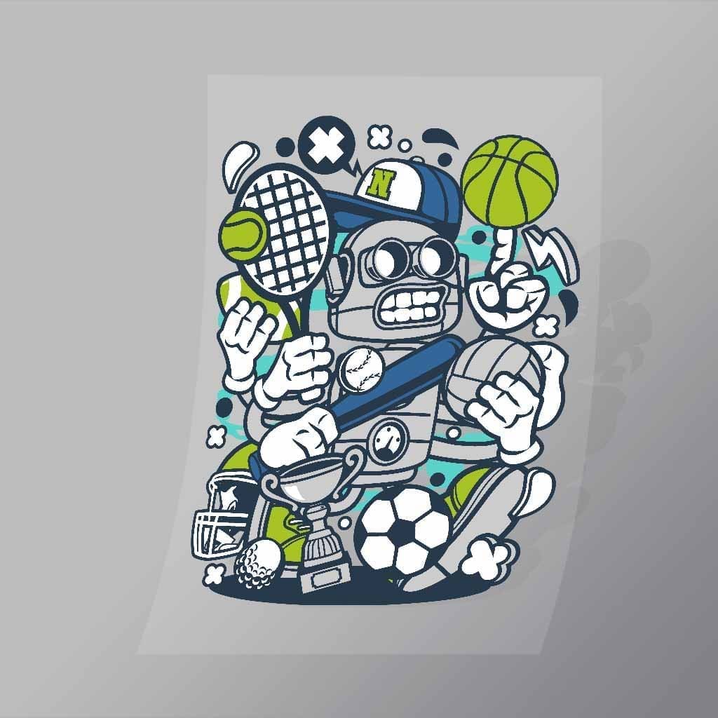 A great Sports Robot DTF (Direct to Film) Transfer available in multiple sizes. (Beased on width at artwork aspect ratio)