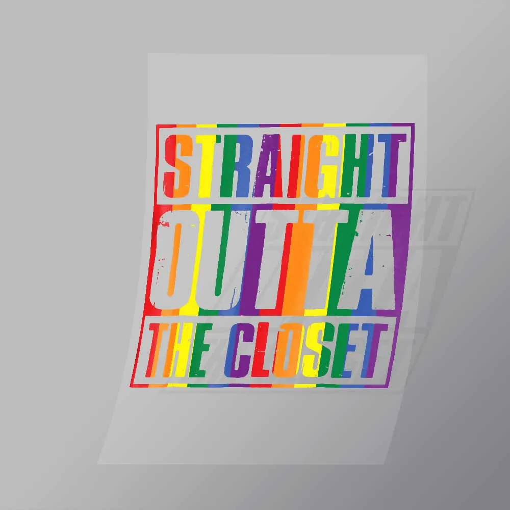 A great Straight Outta The Closet DTF (Direct to Film) Transfer available in multiple sizes. (Beased on width at artwork aspect ratio)