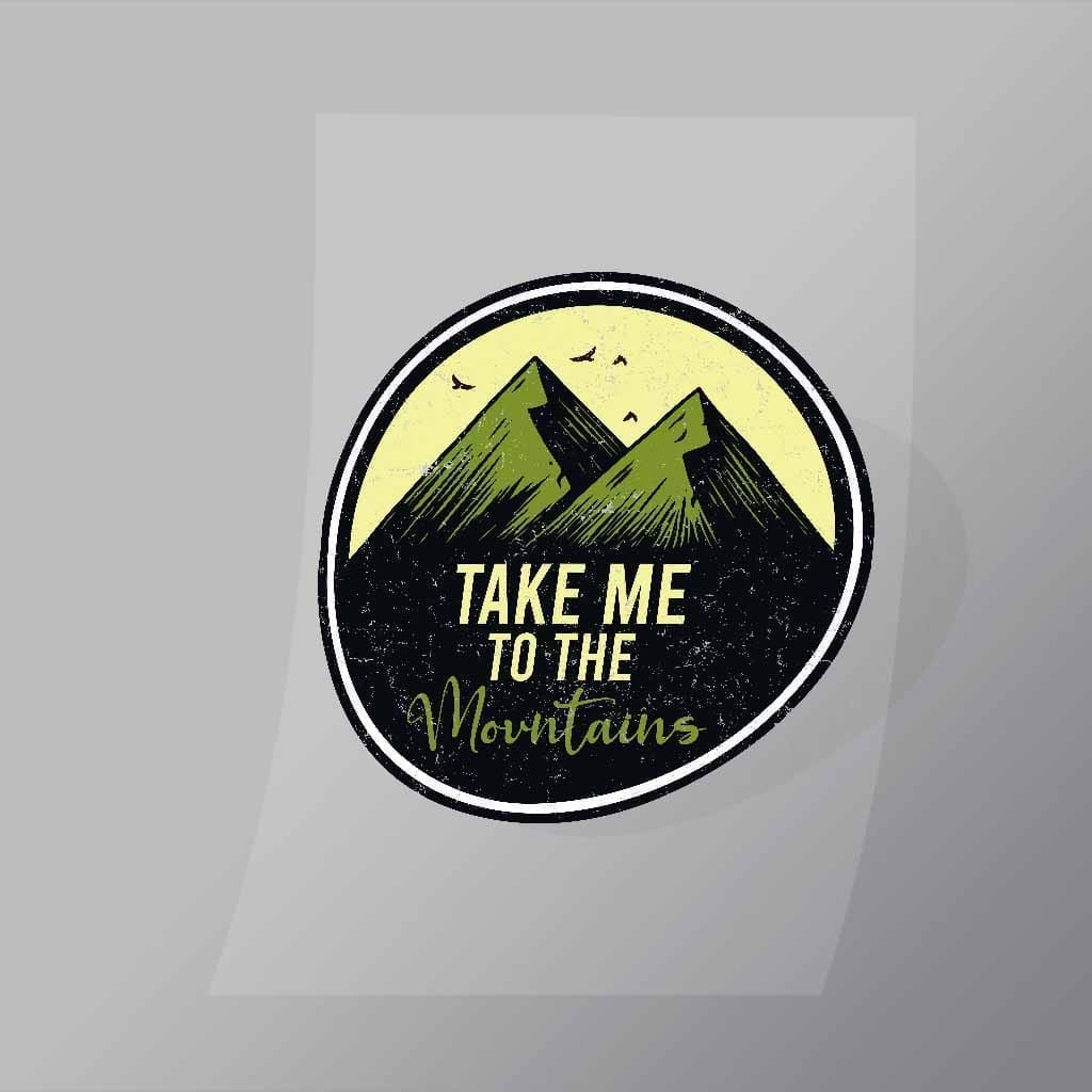 A great Take Me To The Mountains DTF (Direct to Film) Transfer available in multiple sizes. (Beased on width at artwork aspect ratio)