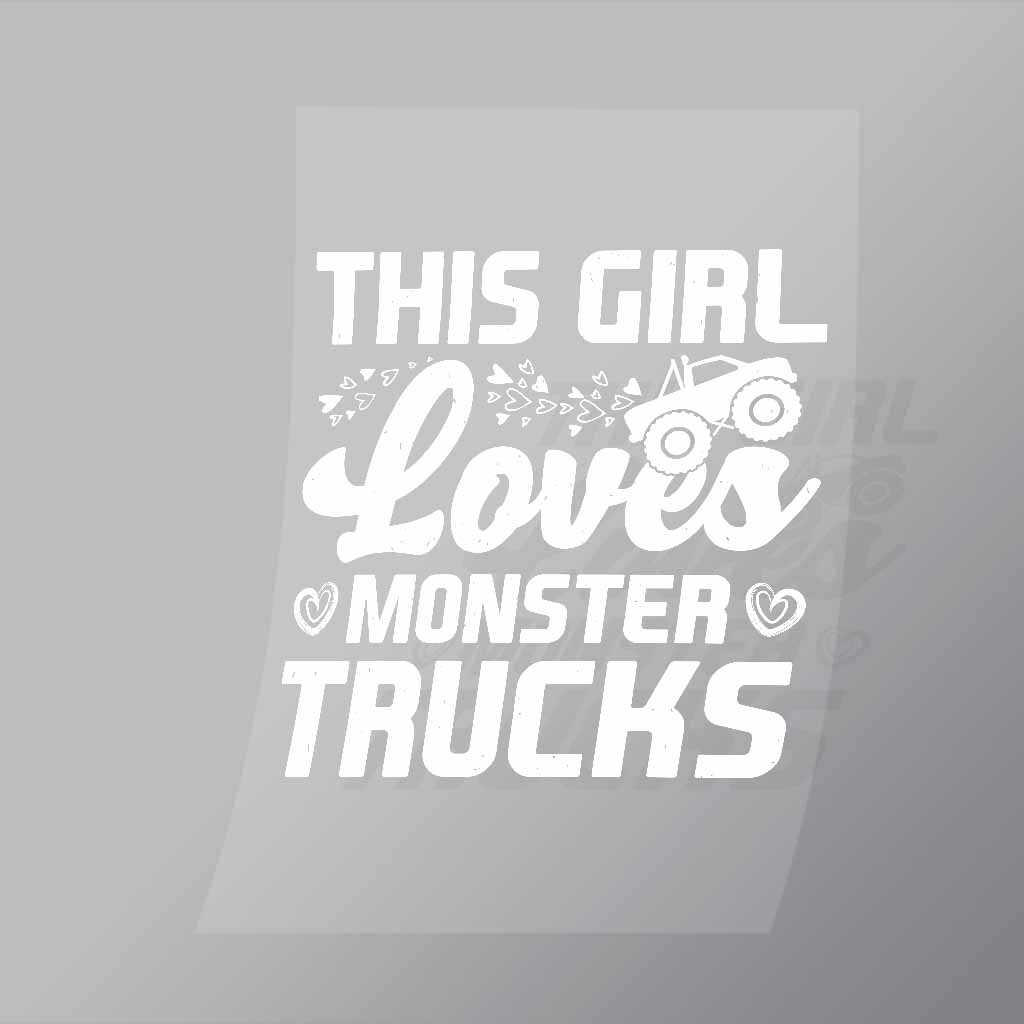 A great This Girl Loves Monster Trucks DTF (Direct to Film) Transfer available in multiple sizes. (Beased on width at artwork aspect ratio)