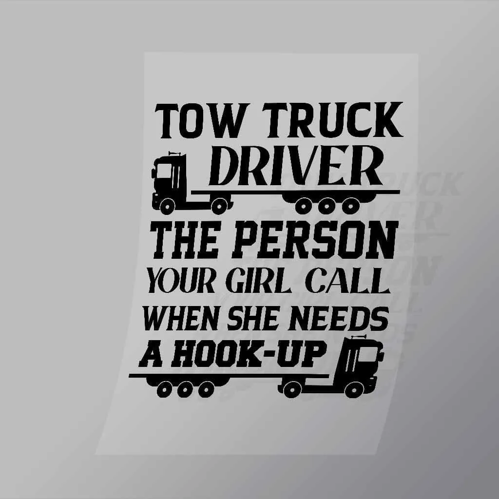 A great Tow Truck Driver The Person Your Girl Call When She Needs A Hook Up DTF (Direct to Film) Transfer available in multiple sizes. (Beased on width at artwork aspect ratio)