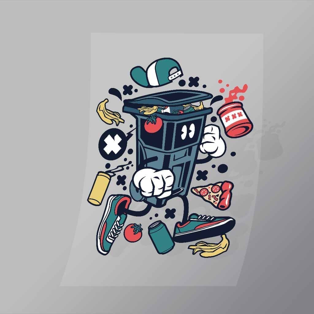 A great Trash Can DTF (Direct to Film) Transfer available in multiple sizes. (Beased on width at artwork aspect ratio)