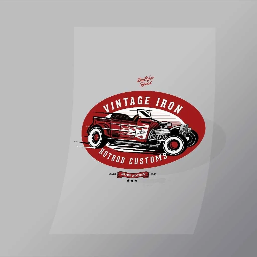 A great Vintage Iron Hotrod Customs DTF (Direct to Film) Transfer available in multiple sizes. (Beased on width at artwork aspect ratio)