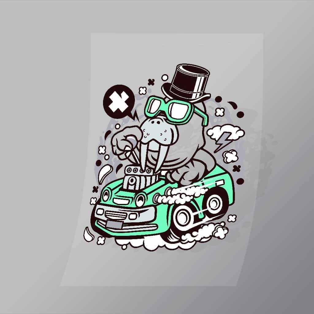 A great Walrus Hotrod DTF (Direct to Film) Transfer available in multiple sizes. (Beased on width at artwork aspect ratio)