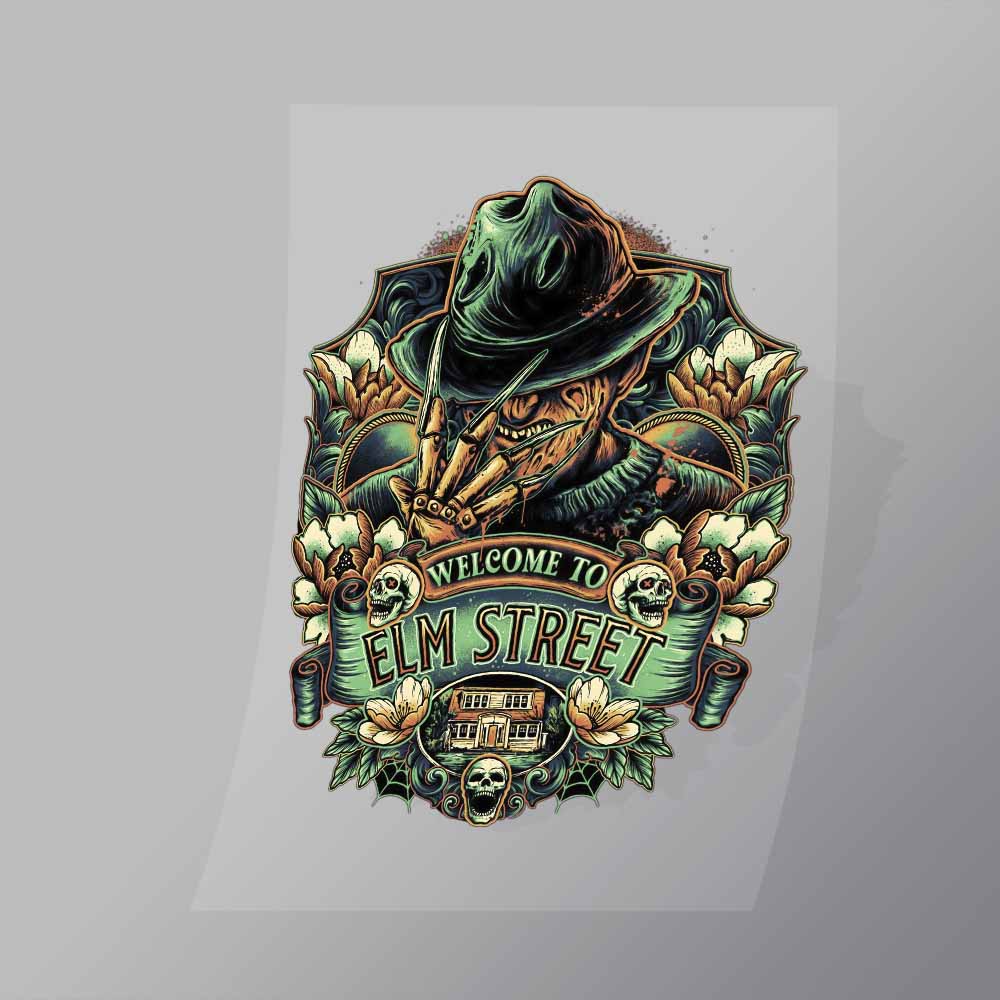 A great Welcome To Elm Street DTF (Direct to Film) Transfer available in multiple sizes. (Beased on width at artwork aspect ratio)