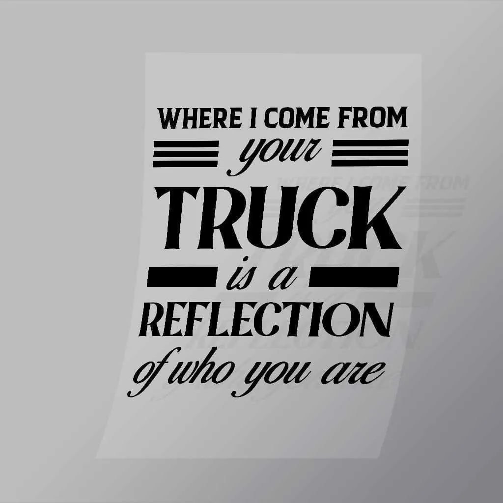 A great Where I Come From Your Truck Is A Reflection Of Who You Are DTF (Direct to Film) Transfer available in multiple sizes. (Beased on width at artwork aspect ratio)