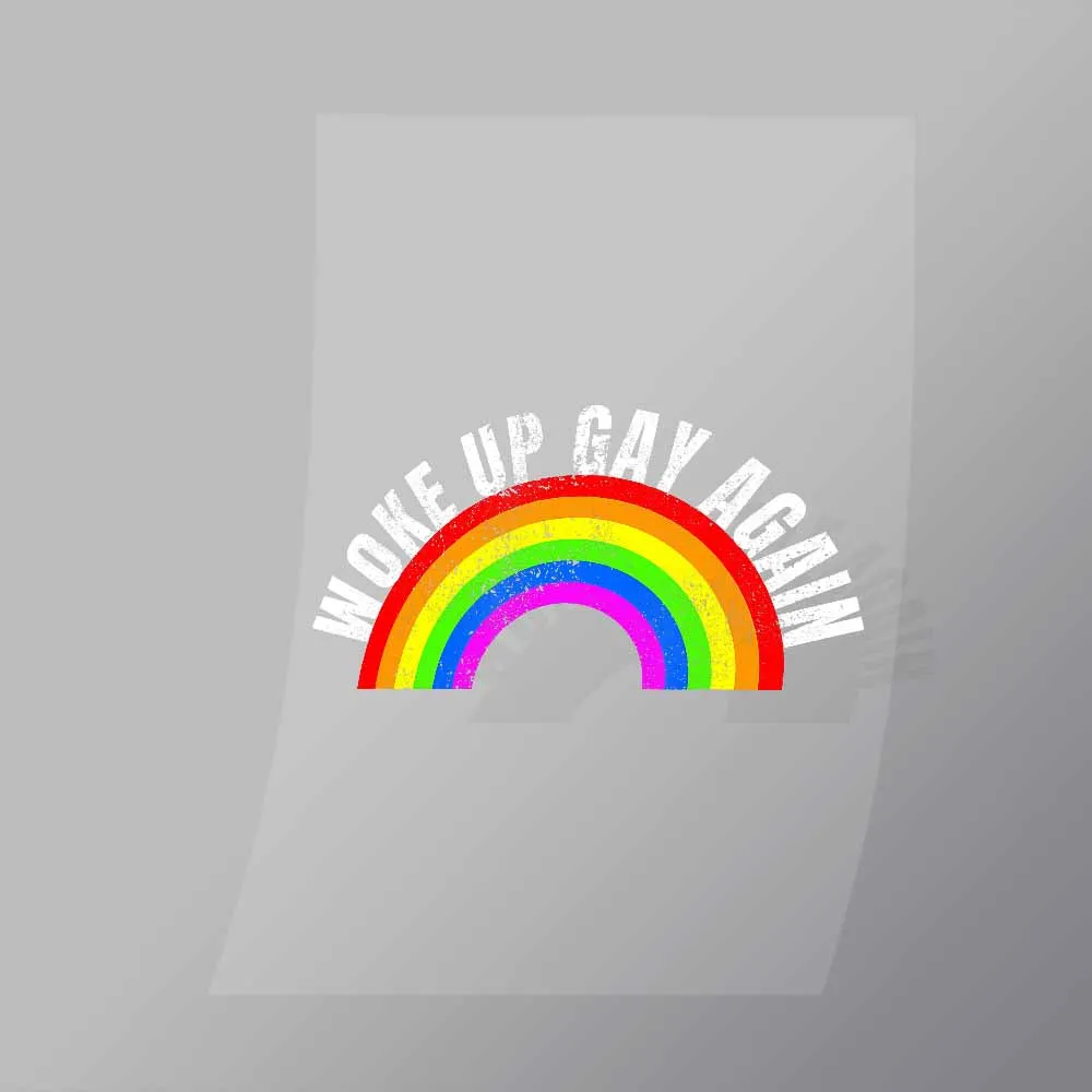 A great Woke Up Gay Again DTF (Direct to Film) Transfer available in multiple sizes. (Beased on width at artwork aspect ratio)