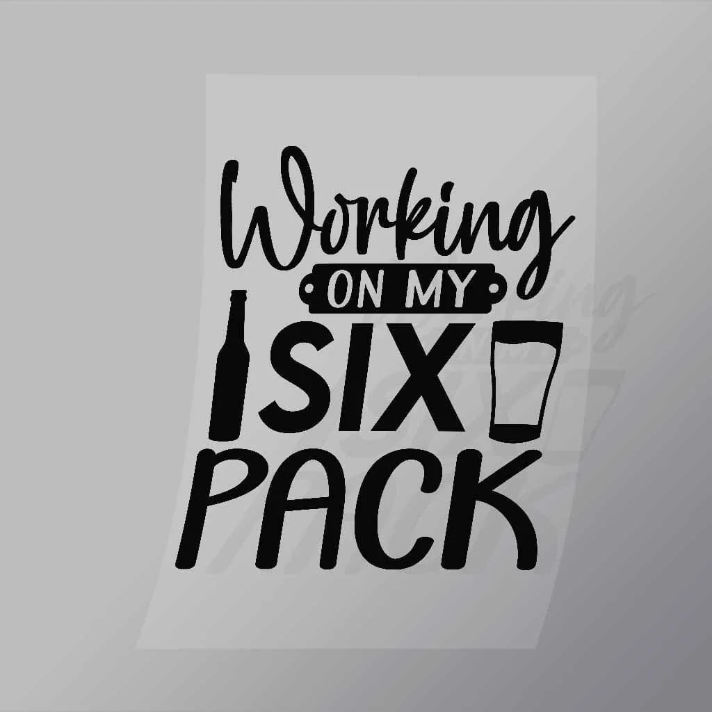 A great Working On My Six Pack Black DTF (Direct to Film) Transfer available in multiple sizes. (Beased on width at artwork aspect ratio)