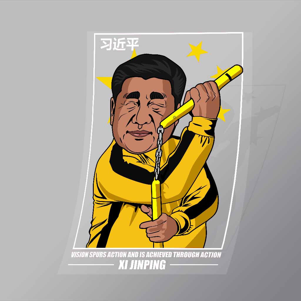 A great Xi Jinping Bruce Lee DTF (Direct to Film) Transfer available in multiple sizes. (Beased on width at artwork aspect ratio)