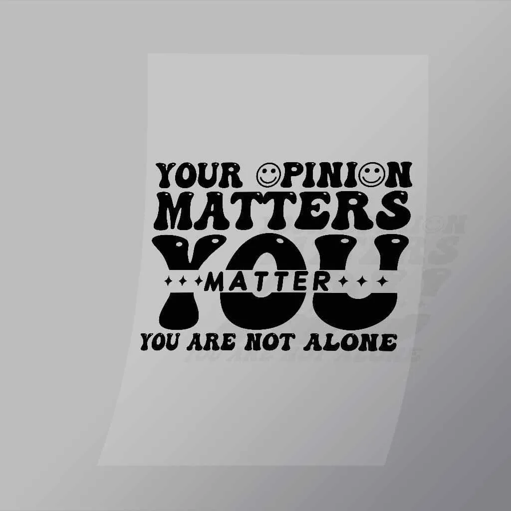 A great Your Opinion Matters You Matter DTF (Direct to Film) Transfer available in multiple sizes. (Beased on width at artwork aspect ratio)